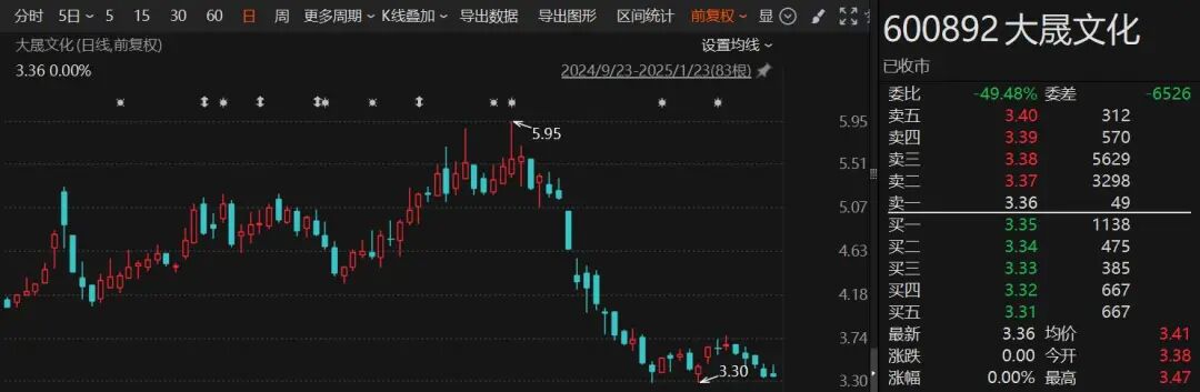 大晟文化公告称,预计2024年年度利润总额亏损3900万元至7800万元,归属于母公司所有者的净利润亏损3500万元至7000万元,扣除非经常性损益后的净利润亏损3350万元至6700万元。预计实现营业收入1.5亿元至2亿元,扣除与主营业务无关的业务收入和不具备商业实质的收入后的营业收入为1.4亿元至1.9亿元,低于3亿元。如公司经审计的利润总额、净利润或者扣除非经常性损益后的净利润孰低者为负值且营业收入低于3亿元,将触及退市风险警示情形,公司股票在2024年年度报告披露后将可能被实施退市风险警示(在公司股票简称前冠以“*ST”字样)。