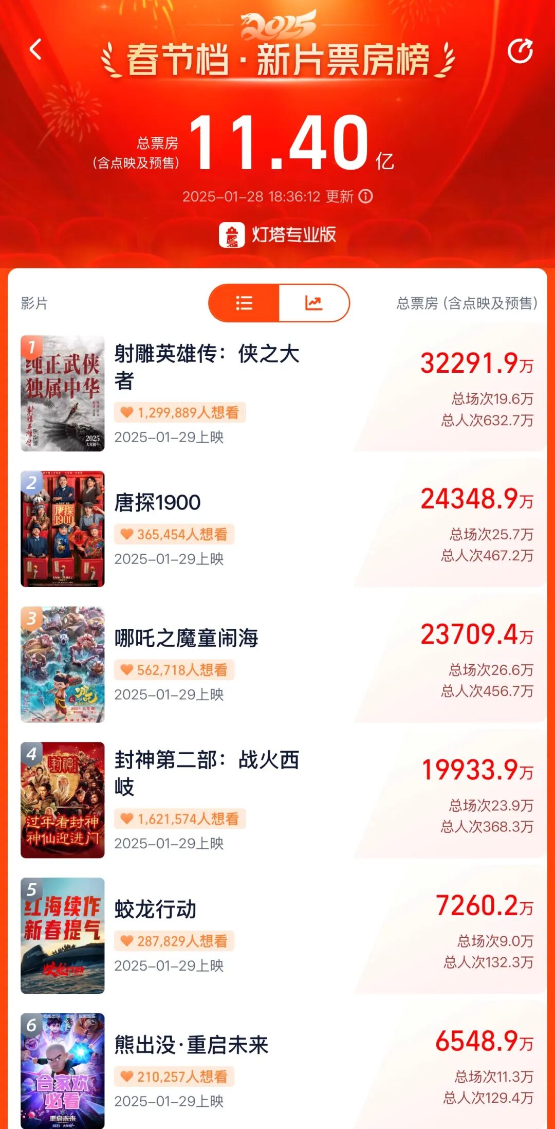 灯塔数据显示,截至1月28日18时,2025年春节档预售票房已超过11亿元。