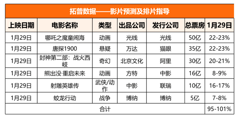 在具体影片方面,拓普数据预测,《哪吒之魔童脑海》有望冲击50亿元大关。而《唐探1900》和《封神第二部》票房均有望超过30亿元。2025年春节档或将首次有3部影片票房破30亿元。