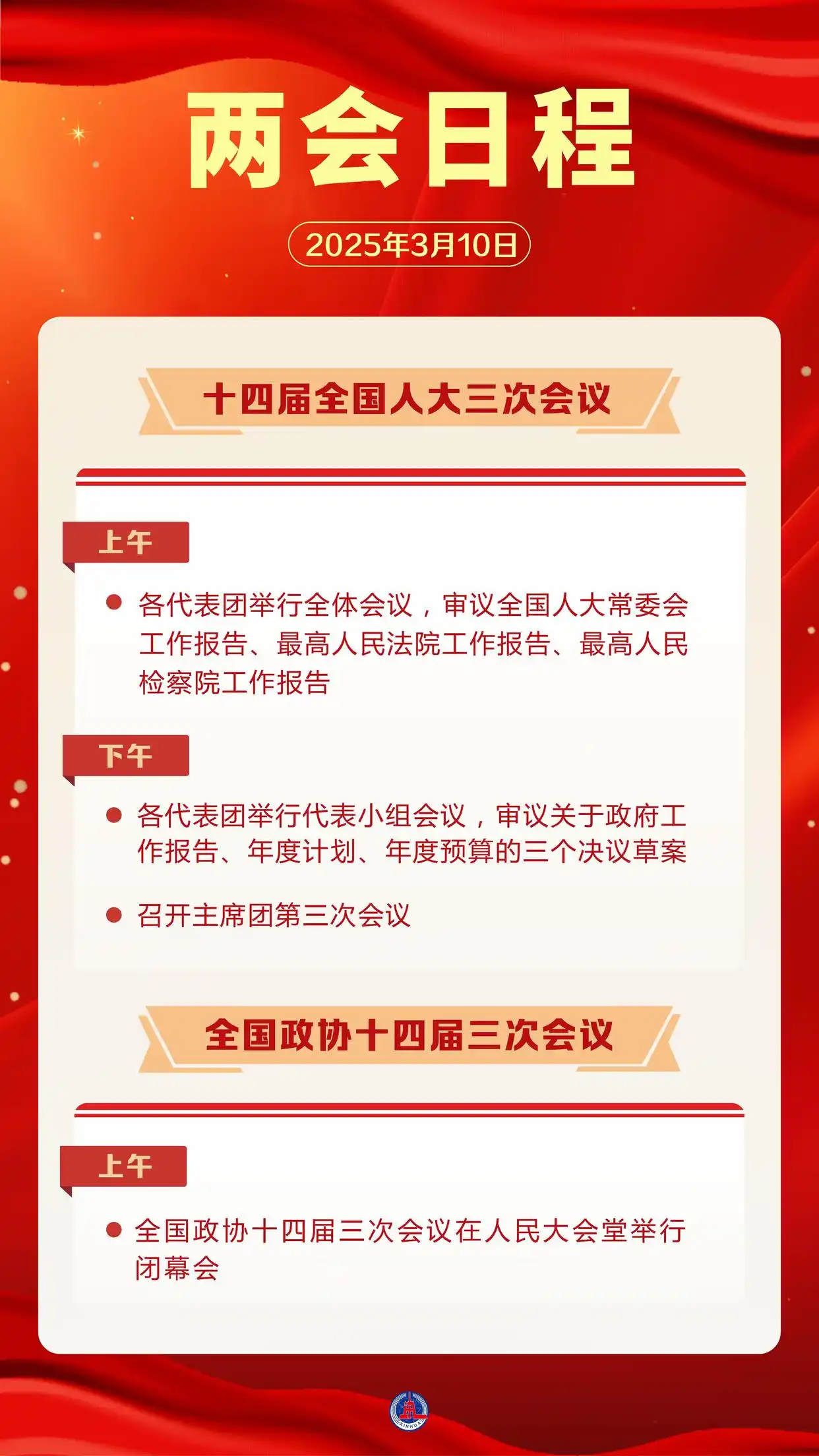 两会日程预告|3月10日:人代会审议全国人大常委会工作报告等 全国政协十四届三次会议闭幕