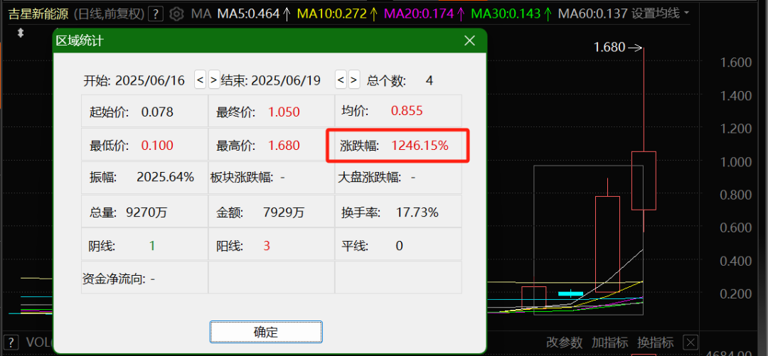 吉星新能源在昨日暴涨343%后,今日盘中再度飙涨逾115%,创6年半新高。最终该股收涨34.62%,近4个交易日累计涨幅为1246%。