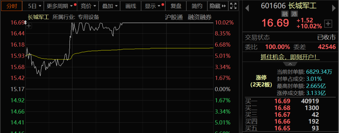 同样在以伊冲突影响下,地面兵装板块近日连续走强,今日午后再度强势拉升,板块指数由跌逾2%转为涨逾2%,连续第5天收阳,创近3年新高。北方长龙临近尾市20%涨停,这已是近5个交易日来第3度涨停,股价创历史新高(复权,下同);长城军工亦连续第2日涨停创近5年新高。