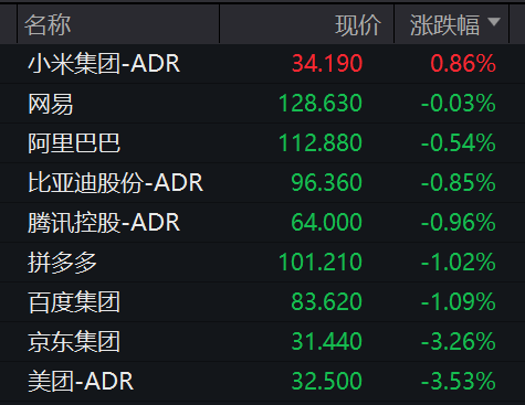 中概股多数收跌,纳斯达克中国金龙指数下跌0.92%,万得中概股100指数下跌4%。中概科技龙头方面,京东集团、美团均跌超3%。