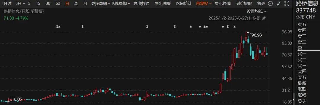 在北证50指数的强势带动下,北交所一批个股表现出色,涨幅惊人。Wind统计显示,截至6月27日收盘,总共有26只个股涨幅超过100%,其中九菱科技、路桥信息、华光源海的累计涨幅超过200%。路桥信息的主营业务为运用人工智能、物联网、大数据、云计算等新一代信息技术为交通领域提供信息化产品和解决方案,以及运维、运营等服务。其股价自5月28日至6月16日急速飙升,区间涨幅超过235.05%。