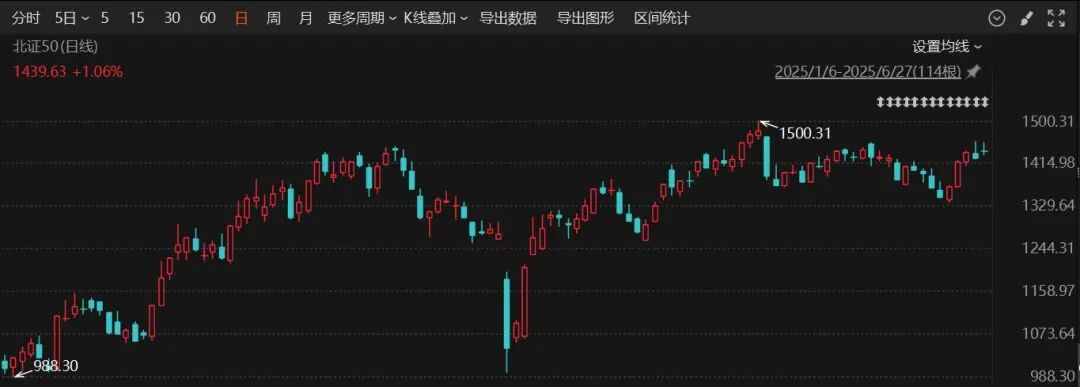 2025年以来,北证50指数一路震荡上行,在5月21日一度突破1500点大关,最高涨幅接近45%;截至6月27日收盘,年内累计涨38.72%,在各大指数中独领风骚。