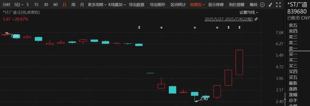 同日,根据*ST广道发布的股票交易风险提示暨停牌核查公告,公司股票于2025年6月25日至2025年6月26日连续2个交易日以内收盘价涨幅偏离值累计达到68.20%,公司于2025年6月27日停牌,就股票交易异常波动情况进行核查,并于2025年7月4日披露核查公告后复牌。公司股票当日收盘价涨幅达到29.87%,股票继续涨停。