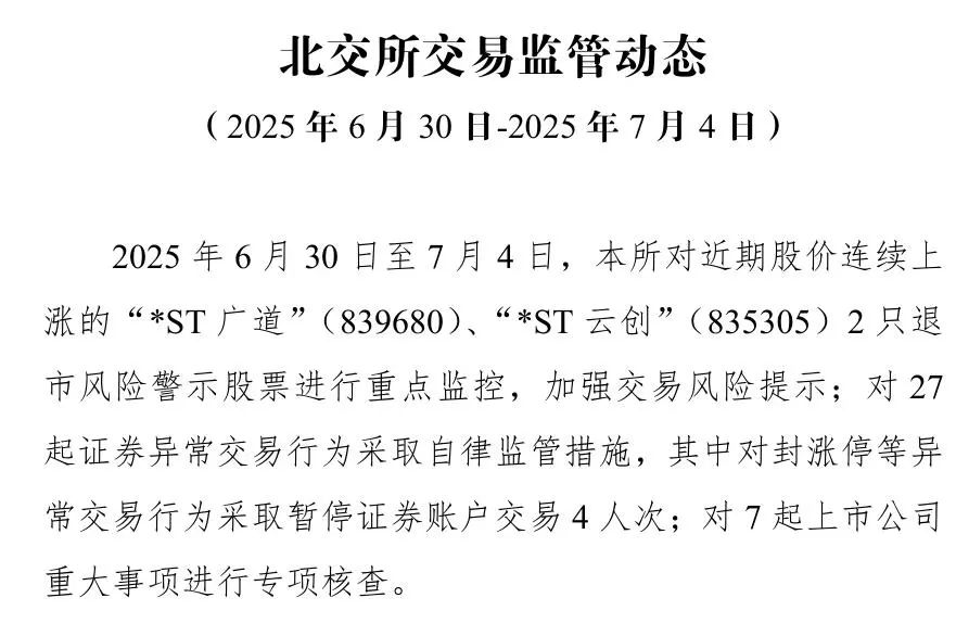 据披露,2025年6月30日至7月4日,本所对近期股价连续上涨的“*ST广道”(839680)、“*ST云创”(835305)2只退市风险警示股票进行重点监控,加强交易风险提示;对27起证券异常交易行为采取自律监管措施,其中对封涨停等异常交易行为采取暂停证券账户交易4人次;对7起上市公司重大事项进行专项核查。