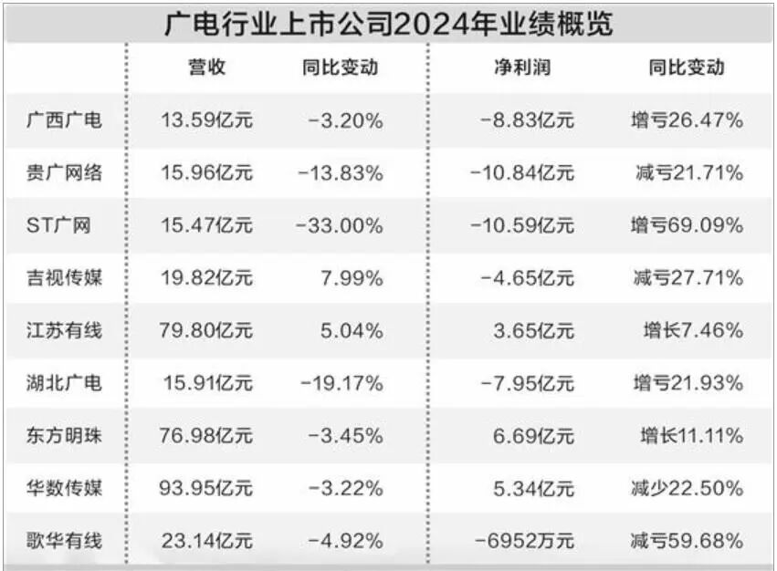 以广西广电为例。公司2024年营收下降3.2%、净利润亏损扩大26.47%,今年一季度,营收同比小幅下滑5.78%,亏损规模继续扩大13.43%。