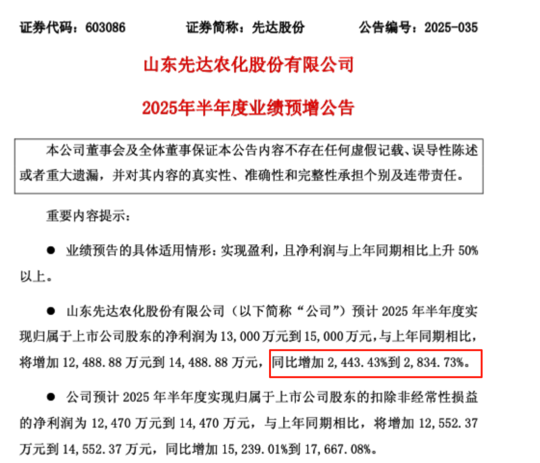 7月9日晚间,先达股份发布业绩预告,预计2025年半年度净利润为1.3亿元到1.5亿元,同比增长24.43倍至28.35倍;扣非后净利润为1.25亿元至1.45亿元,同比由负转正。