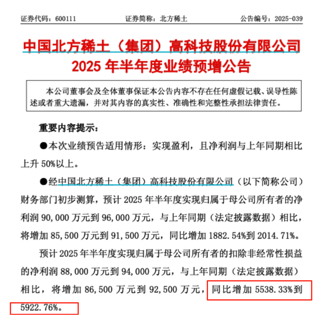 7月9日盘后,北方稀土公告,经公司财务部门初步测算,预计2025年半年度实现归母净利润9亿元到9.6亿元,与上年同期相比,将增加8.55亿元到9.15亿元,同比增长1882.54%到2014.71%。预计2025年半年度实现归母扣非净利润8.8亿元到9.4亿元,与上年同期相比,将增加8.65亿元到9.25亿元,同比增长5538.33%到5922.76%。