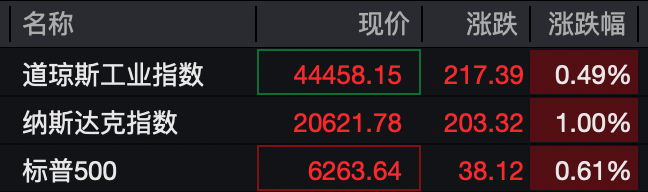 截至发稿,道指、纳指均涨超200点,分别上涨0.49%、1%,标普500指数涨0.61%。