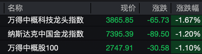 中概股表现相对较弱。截至发稿,纳斯达克中国金龙指数跌超1%。