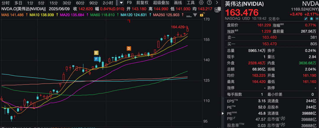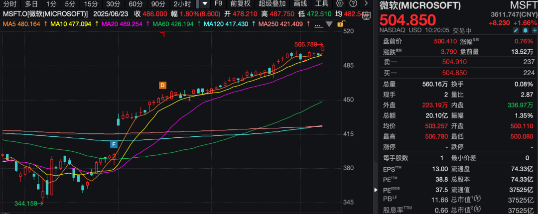 英伟达盘中涨超2%,再创历史新高,成为全球首家市值达到4万亿美元的公司。微软盘中股价站上500美元/股关口,总市值仅次于英伟达。