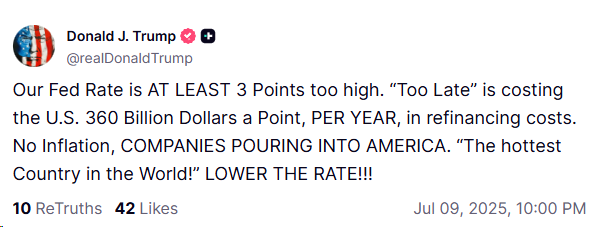 而关于利率水平,特朗普刚刚再次发声:美联储的利率至少高了3个百分点。“太迟先生”(即鲍威尔)每年让美国在再融资成本上付出3600亿美元的代价。他表示,美国现在没有通胀,要求美联储降低利率。
