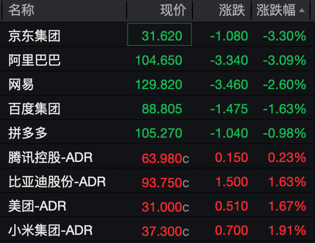 热门中概股涨跌不一。京东集团、阿里巴巴均跌超3%。