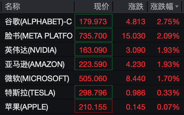 美股大型科技股全线上涨。谷歌、脸书均涨超2%。
