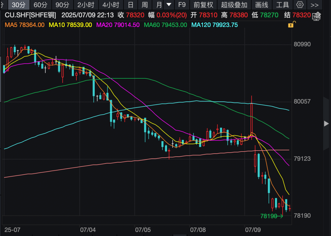 另外,在特朗普表示考虑对进口到美国的铜征收50%的附加税后,美国铜价飙升。而市场担心提高关税会降低需求,因此伦铜和沪铜则应声下跌。7月9日晚间开盘,沪铜期货主力合约跌至78000元/吨附近。