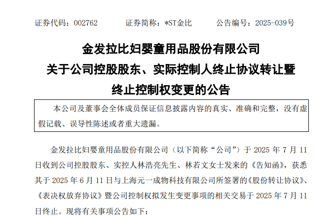 7月11日,*ST金比收到控股股东、实际控制人林浩亮先生、林若文女士发来的《告知函》,获悉其与元一成物的控制权转让交易经双方友好协商一致于7月11日终止,公司控股股东、实际控制人仍为林浩亮、林若文夫妇。*ST金比在公告中提到,“因受让方实际控制人涉及家族财产清算纠纷,对本次交易落实带来不确定性影响,经交易双方友好协商,一致同意终止本次股权转让交易程序”。