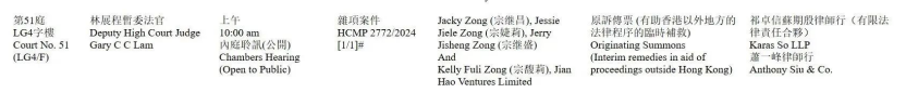 宗馥莉近期因资产纠纷在香港被起诉,三名原告是宗继昌(Jacky Zong)、宗婕莉(Jessie Zong)和宗继盛(Jerry Zong)。据原告律师确认,这三人是宗馥莉的“同父异母弟妹”。三人要求冻结香港汇丰银行账户内约18亿美元资产,并追索父亲生前承诺的21亿美元信托权益(约150亿元人民币)。