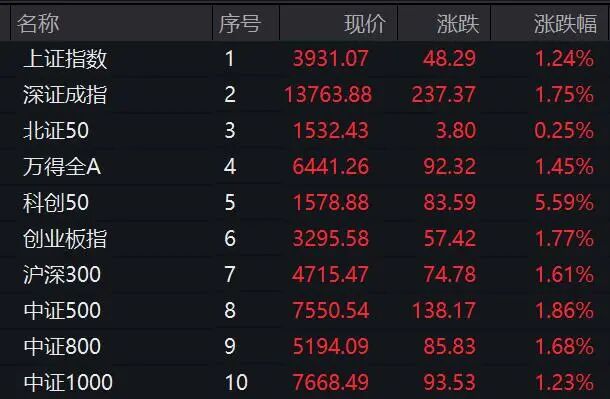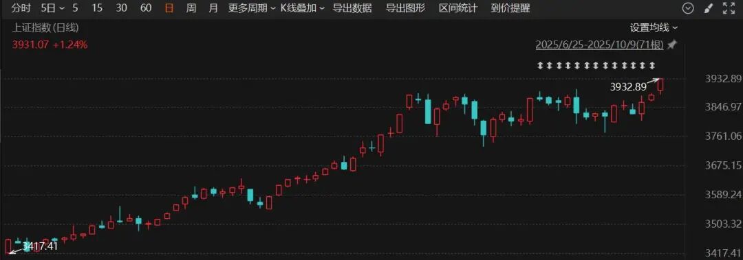 10月9日,是国庆长假后首个交易日,A股全面高开高走,上证指数突破3900点,再创10年新高,科创50则盘中大涨逾6%,创4年多来新高,深证成指、创业板指、沪深300等也纷纷创出多年新高。市场成交呈快速放大趋势,开盘不到1小时成交就超过万亿元。