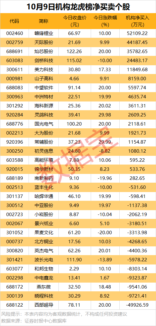 今日龙虎榜中,净买入的个股17只,净卖出的个股14只。14股净买入金额均超千万元,赣锋锂业获机构净买入5.21亿元,居首;其次是天际股份、灿芯股份、剑桥科技,获净买入均超2.4亿元。