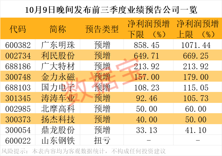 10月9日晚间,多家上市公司发布三季报业绩预增公告。以预增上限统计,广东明珠、利民股份、广大特材、金力永磁、国力电子、涛涛车业预计前三季度归母净利润同比翻番,北摩高科、扬杰科技、鼎龙股份等业绩预增,山东钢铁业绩扭亏。