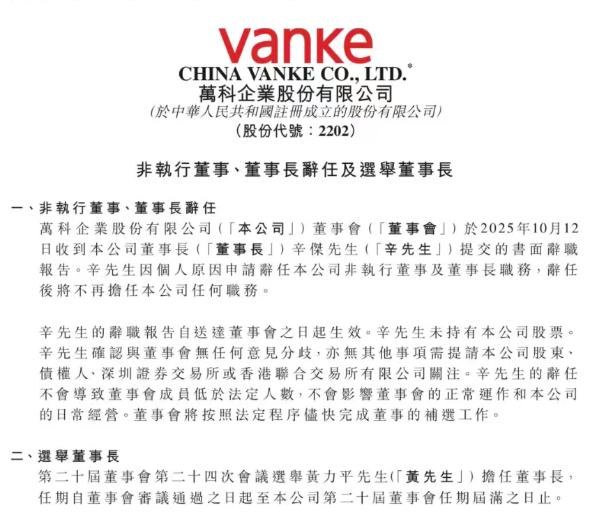 10月13日早上,万科企业在港交公告,于2025年10月12日收到本公司董事长辛杰先生提交的书面辞职报告。辛杰因个人原因申请辞任本公司非执行董事及董事长职务,辞任后将不再担任本公司任何职务。