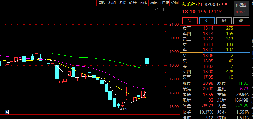 种业概念早间逆市大幅高开,板块指数一度飙升近7%,开盘不到3分钟成交就超过前一交易日全天成交。秋乐种业最高涨近24%,康农种业亦一度涨超20%,万向德农触及涨停,神农种业、绿亨科技等涨幅居前。
