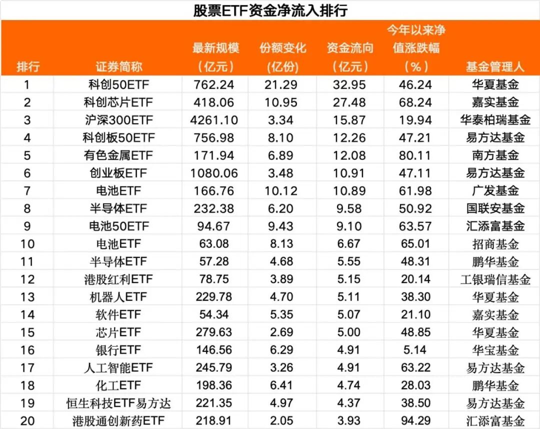 从资金净买入排行榜看,当日净流入1亿元以上的股票ETF有81只,部分宽基ETF净流入居前。其中,华夏科创50ETF、嘉实科创芯片ETF、华泰柏瑞沪深300ETF位居前三,资金净流入均超15亿元。