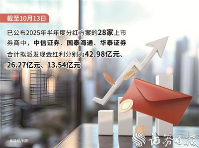 现金分红是上市公司回报投资者的重要形式。为响应政策号召、有效增强投资者获得感,今年以来,券商积极开展半年度分红,截至10月13日,已有28家上市券商公布了2025年半年度分红方案,其中5家券商的半年度分红“红包”已发到投资者手中。