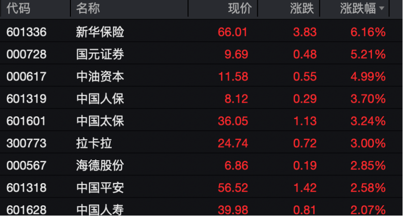 非银金融板块涨幅超过1%,其中新华保险涨幅超过6%,国元证券涨幅超过5%,中油资本、中国人保、中国太保等股票涨幅居前。