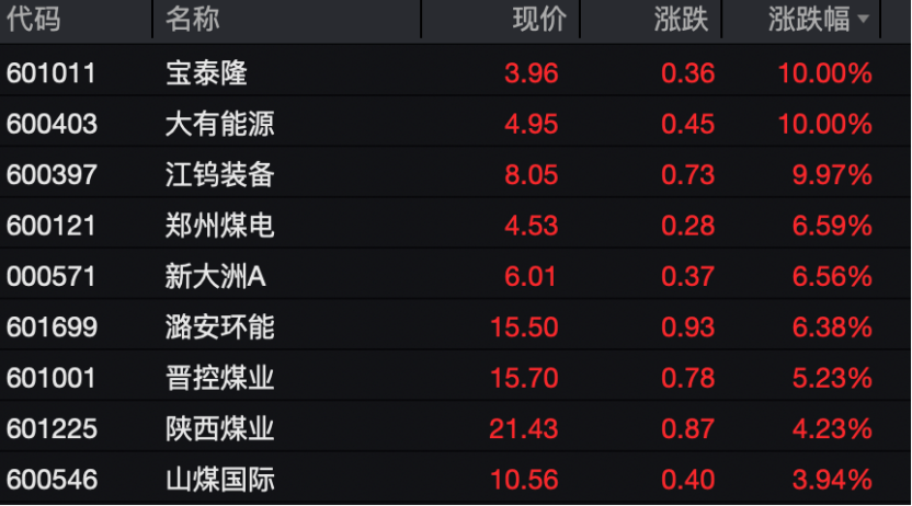 煤炭板块大幅上涨,板块盘中涨幅一度接近3%。大有能源、宝泰隆涨停,郑州煤电、潞安环能等盘中涨幅居前。