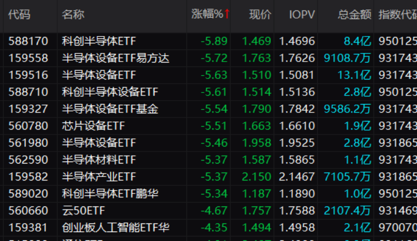 今天(10月14日)上午,A股市场跳空高开后冲高回落,科技股大幅调整,拖累市场人气,多只半导体相关ETF跌幅超过5%。大金融板块走强,成为上午A股市场主要亮点之一。