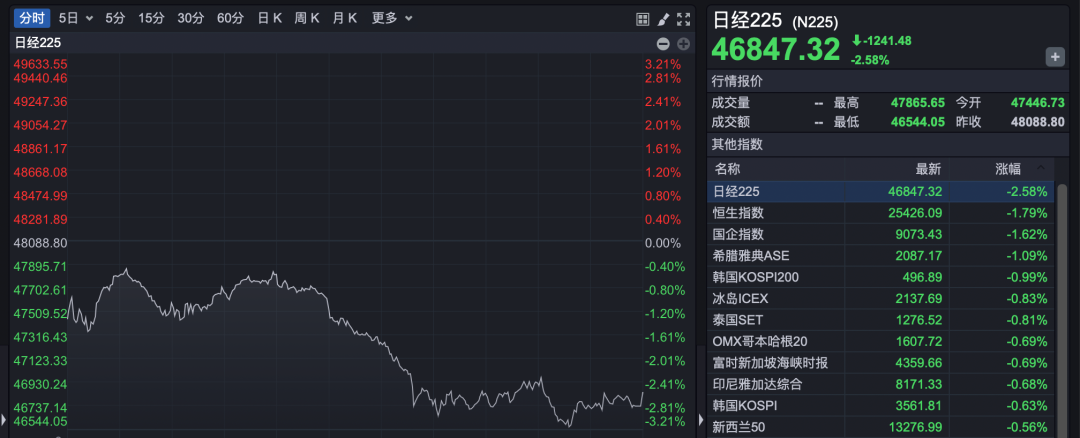 亚太股市明显跳水。截至收盘,日经225指数收跌2.58%,报46847.32点;韩国KOSPI指数收跌0.63%,报3561.81点。