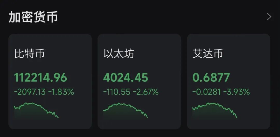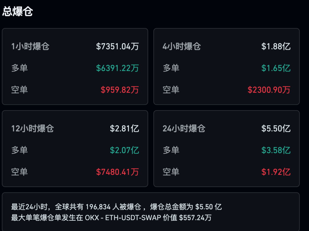 加密货币市场也出现回调。截至发稿,比特币下跌1.83%,以太坊跌2.67%。24小时内,全球近20万人爆仓。