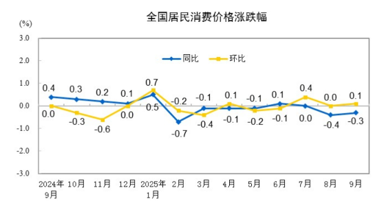 9月份,全国居民消费价格环比上涨0.1%。其中,城市持平,农村上涨0.2%;食品价格上涨0.7%,非食品价格下降0.1%;消费品价格上涨0.3%,服务价格下降0.3%。
