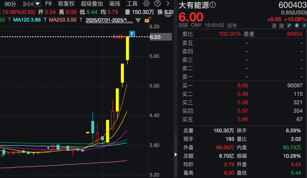 煤炭股全天保持强势,板块指数放量大涨逾3%,以光头光脚中阳线报收。龙头股大有能源再度强势涨停,近5个交易日收获4个涨停板,股价创3年多以来新高,中煤能源、郑州煤电、山煤国际等涨幅居前,并均创年内新高。