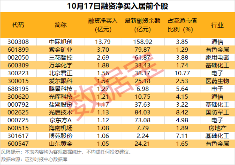 具体到个股,10月17日获融资净买入千万元以上的有277只,其中14只融资净买入额超亿元。中际旭创融资净买入额居首,当日净买入13.79亿元;其次是紫金矿业、三花智控,融资净买入金额分别为3.70亿元、2.69亿元;融资净买入金额居前的还有万华化学、北京君正、爱尔眼科等。