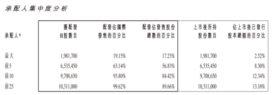 而在股权集中度上,前25名承配人占到了国际发售的比例达到99.62%,共计约1031万股。