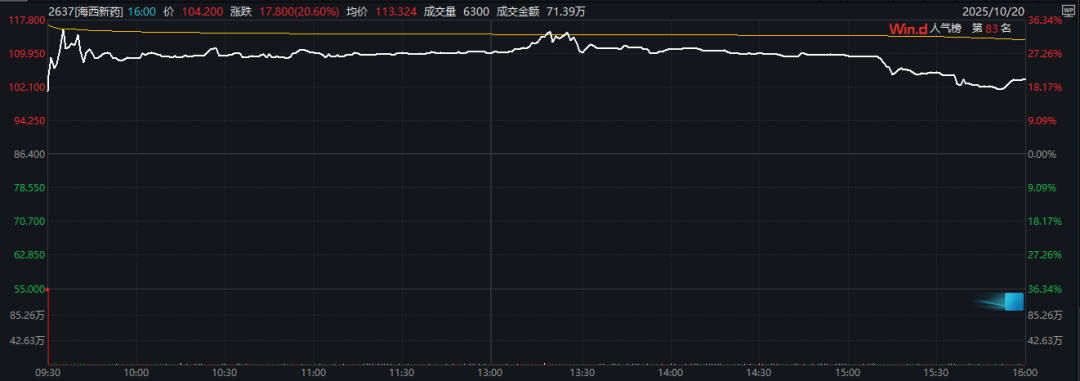 10月20日,海西新药正式登陆港股市场。Wind行情显示,海西新药上市首日盘中一度涨超36%,收盘上涨20.60%。这一涨幅在近期港股上市的创新药概念股中,表现并不抢眼。