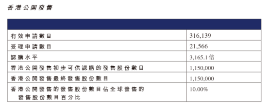 在香港公开发售中,超额认购倍数达到3165.1倍,但分配份额仅有115万股,仅占全球发售股份的10%。