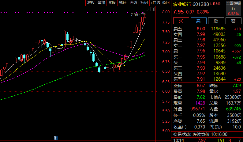 银行板块再度上扬,农业银行14连阳再创新高,银行指数10连阳,江阴银行、中信银行、浙商银行、无锡银行、重庆银行纷纷上扬。