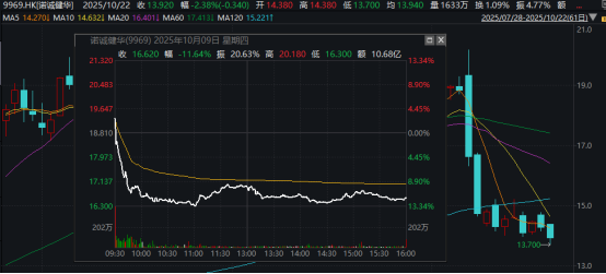 但该消息公布后,诺诚健华的港股股价同样是高开后跳水,并接连大跌。其中10月9日下跌11.64%,10月10日又跌11.49%。