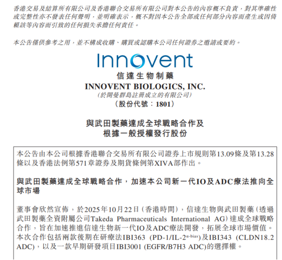 10月22日,信达生物宣布与武田制药达成重磅全球战略合作,共同加速推进信达生物新一代IO与ADC疗法的全球开发,打造颠覆性癌症治疗方案,造福全球患者。