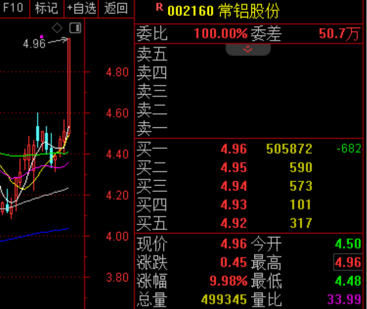 10月23日早盘,有色铝板块逆市上涨。常铝股份(002160)在约9:36股价直线拉升,8分钟内封住涨停板,盘中涨停板封单超50万手。此外,天山铝业、鑫铂股份、云铝股份、中孚实业、神火股份、闽发铝业等也跟随上涨。