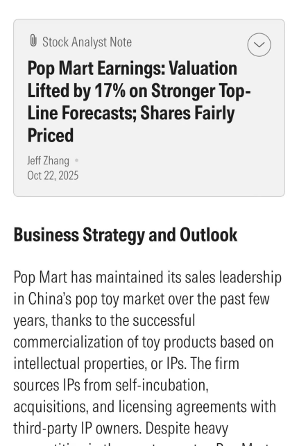 10月16日,摩根大通将泡泡玛特评级从“中性”上调至“增持”,认为其估值已具吸引力,且三季度数据、节假日销售及LABUBU动画等将成为未来催化剂。此外,招商证券在10月21日发布的最新研报维持“强烈推荐”评级。近一个月内,中泰证券、瑞银、华泰证券、摩根士丹利等多家机构也均给予泡泡玛特买入或增持评级。
