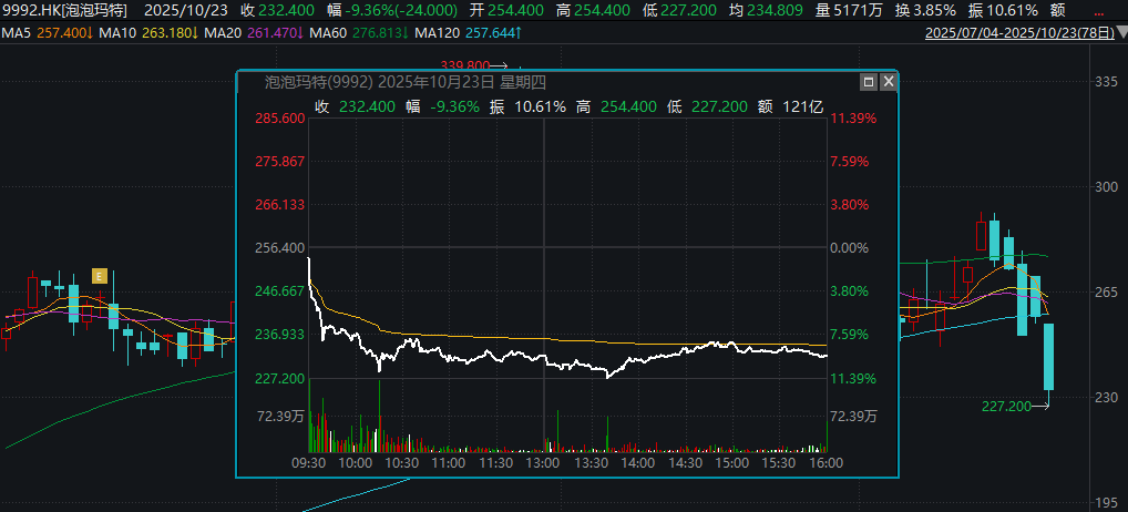 10月23日港股主要指数集体走强,新消费板块部分龙头股却出现大跌。其中,泡泡玛特跌超9%,古茗跌近7%,蜜雪集团跌超4%,老铺黄金跌近2%。