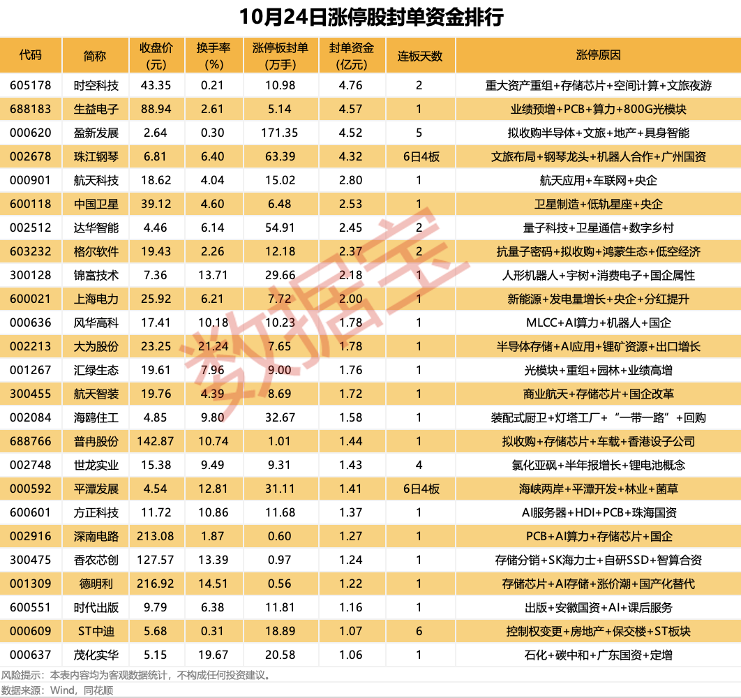 以封单金额计算,27股封单资金均超1亿元,时空科技、生益电子、盈新发展封单资金居前,分别为4.76亿元、4.57亿元、4.52亿元。