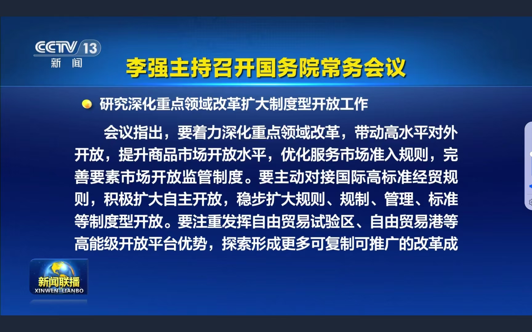 国常会:研究深化重点领域改革扩大制度型开放工作