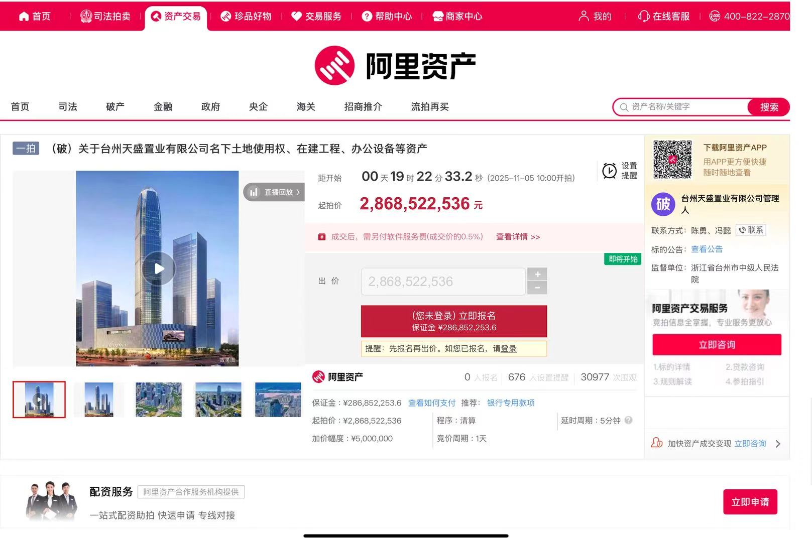 界面新闻查阅司法拍卖平台阿里资产信息显示,本次被拍资产为天盛置业名下“天盛中心”“购物公园”土地使用权、在建工程、办公设备、应收账款等,起拍价约28.685亿元,加价幅度为500万元。